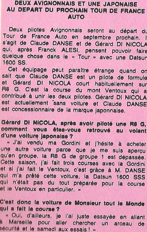J'ai fais RONDE DE LA DURANCE 1990 et 1991 avec DATSUN 1600SSS GROUPE F3