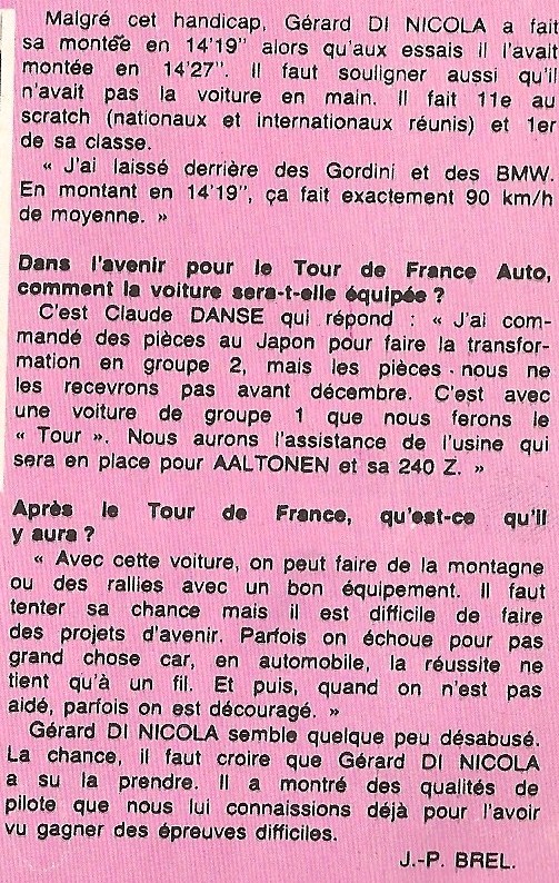désolé je debarque ,....l'article pas la suite , mais quelques lignes, c'est pour çà que j'ai negligé le scan il provient d"une revue que je n'ai plus assez rare "AUTOCOURSE" j'ai des milliers de revues que je vends sur E bay pour le plaisir si j'ai du datsun , nissan original promis de cote et cadeau pour toi ..