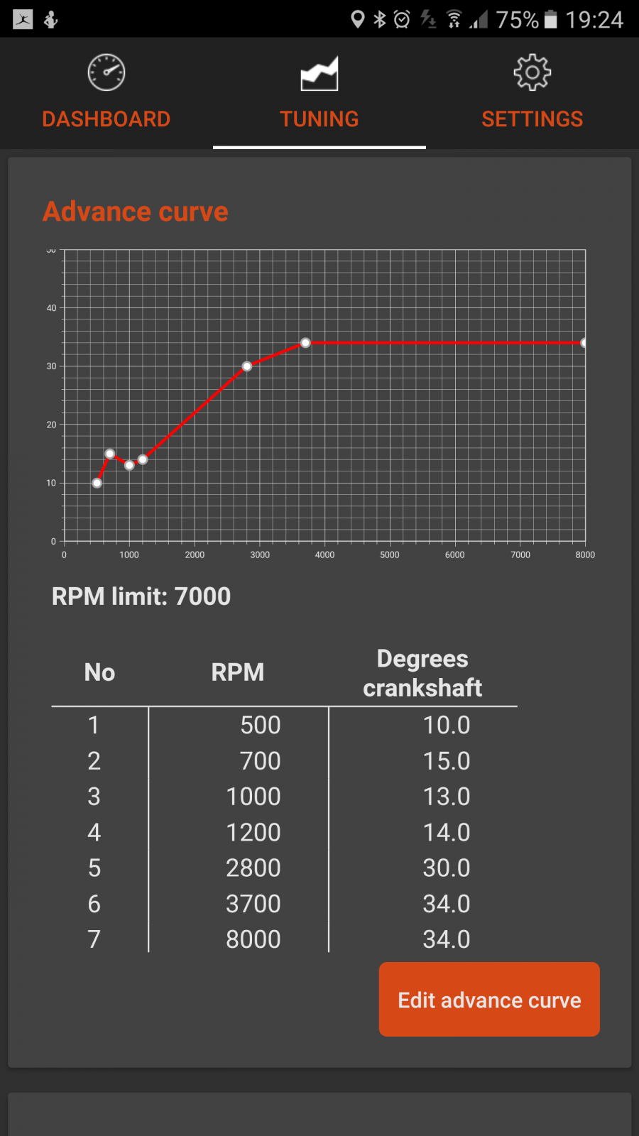 Ma courbe de démarrage ressemblait à celle ci, démarrage au quart de tour en triple weber. J'ai choisi d'enlever un peu d'avance à 1000rpm pour compenser un creux. Ma courbe finale était différente, j'avais 16° au ralenti. Ralenti à 950rpm en Carbus. Commence comme ça.
