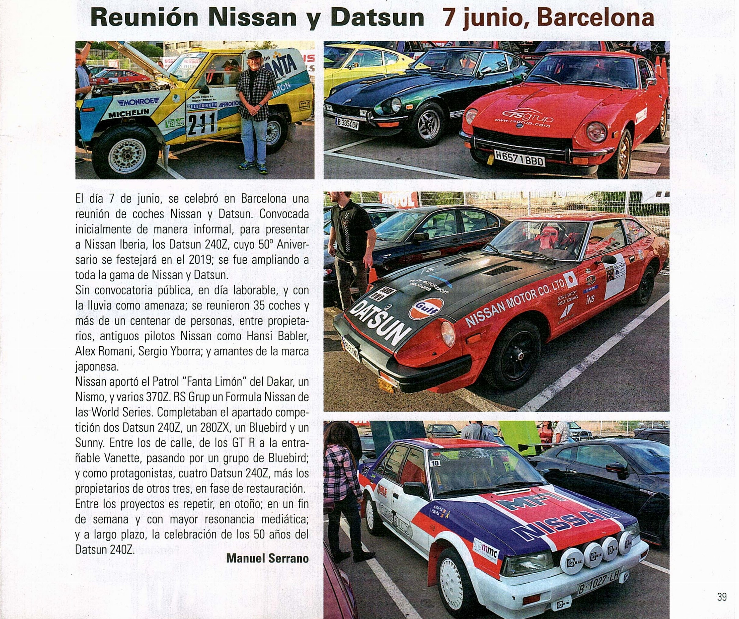 Le jeudi 7 juin, nous ferons une réunion des Nissan et Datsun à Barcelone. Bien que Nissan ait il fabrique à Barcelone, depuis 1.980; le passé dans une compétition de Datsun et de Nissan, est peu connu; et non plus la grande variété de modèles. L'importation de véhicules japonais fut très limitée par les tarifs douaniers et il y a un parc peu abondant en Espagne.