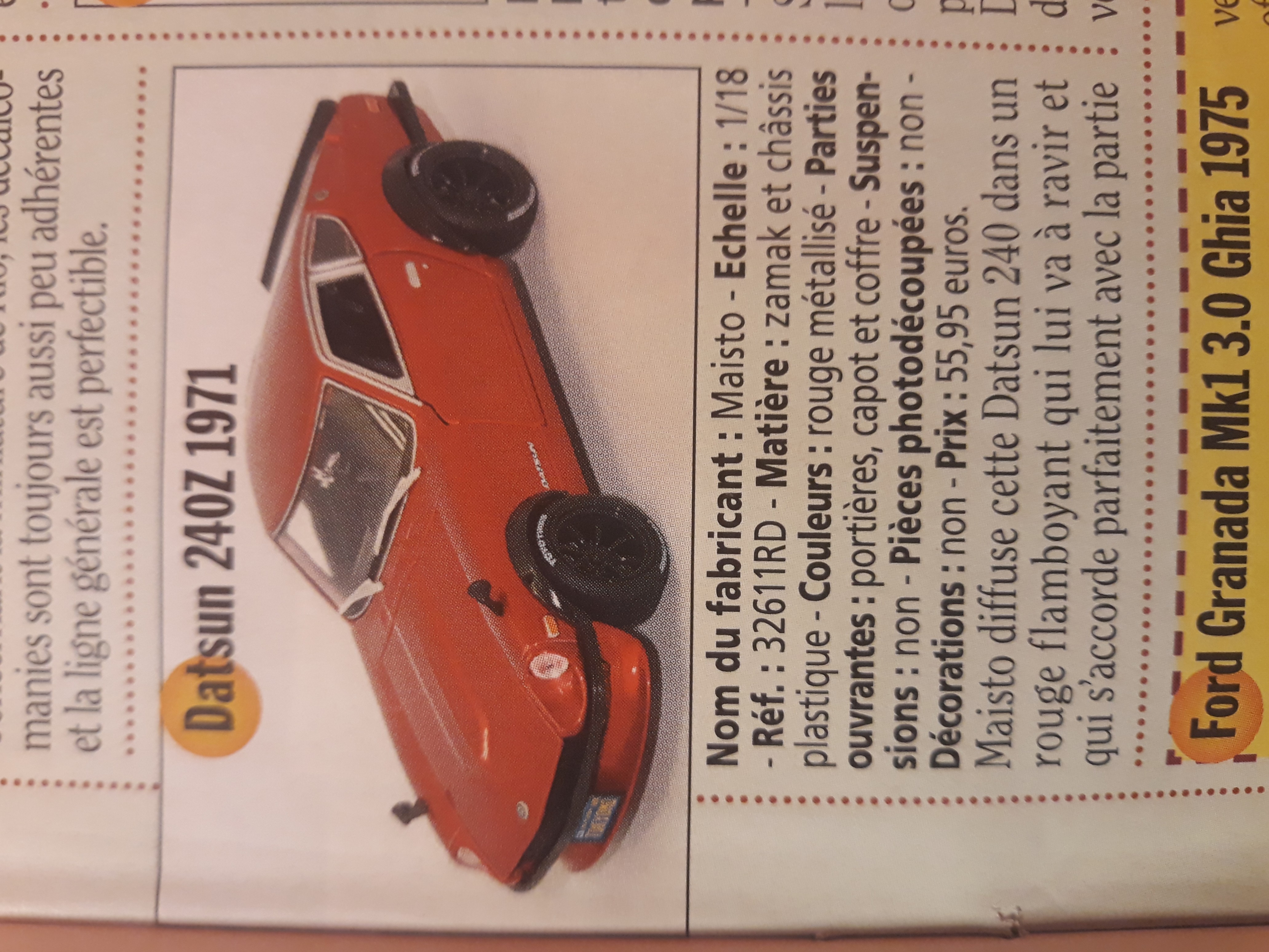 Une nouveauté qui apparait dans le dernier n° de Gazoline Mars '19 page 143, une Datsun 240 Z un peu modifié (Jantes larges noir, élargisseurs, spoiler av., petit becquet ar. et pare-chocs noir, plus les rétros à la mode japonnaise... sur les ailes