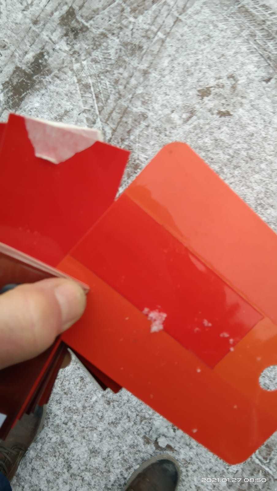 La couleur de base (la couleur témoin) est autour du trou, la bande à droite est celle avec le vernis rouge dosé à 1/100, celle à gauche est dosée à 2/100 et celle du milieu, la plus rouge est dosée à 4/100.