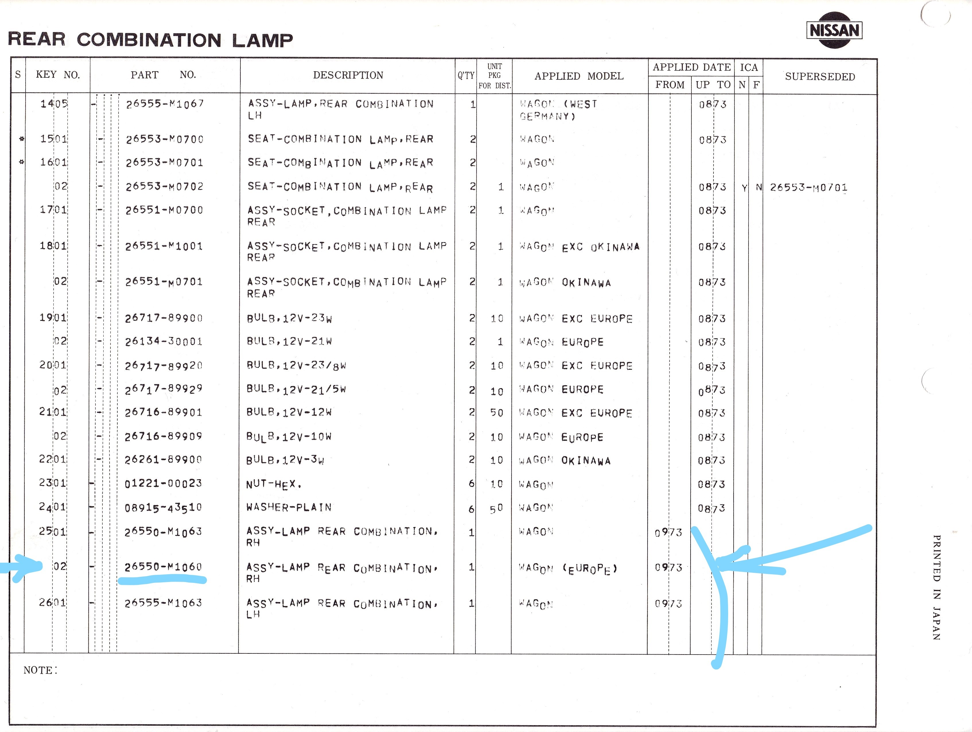trouvé 2 feux arrières gauche du CHERRY VAN 100A ....... code 26559-M1060sur le carton(mais modifié) ...je pense plutôt a 26550-M1060