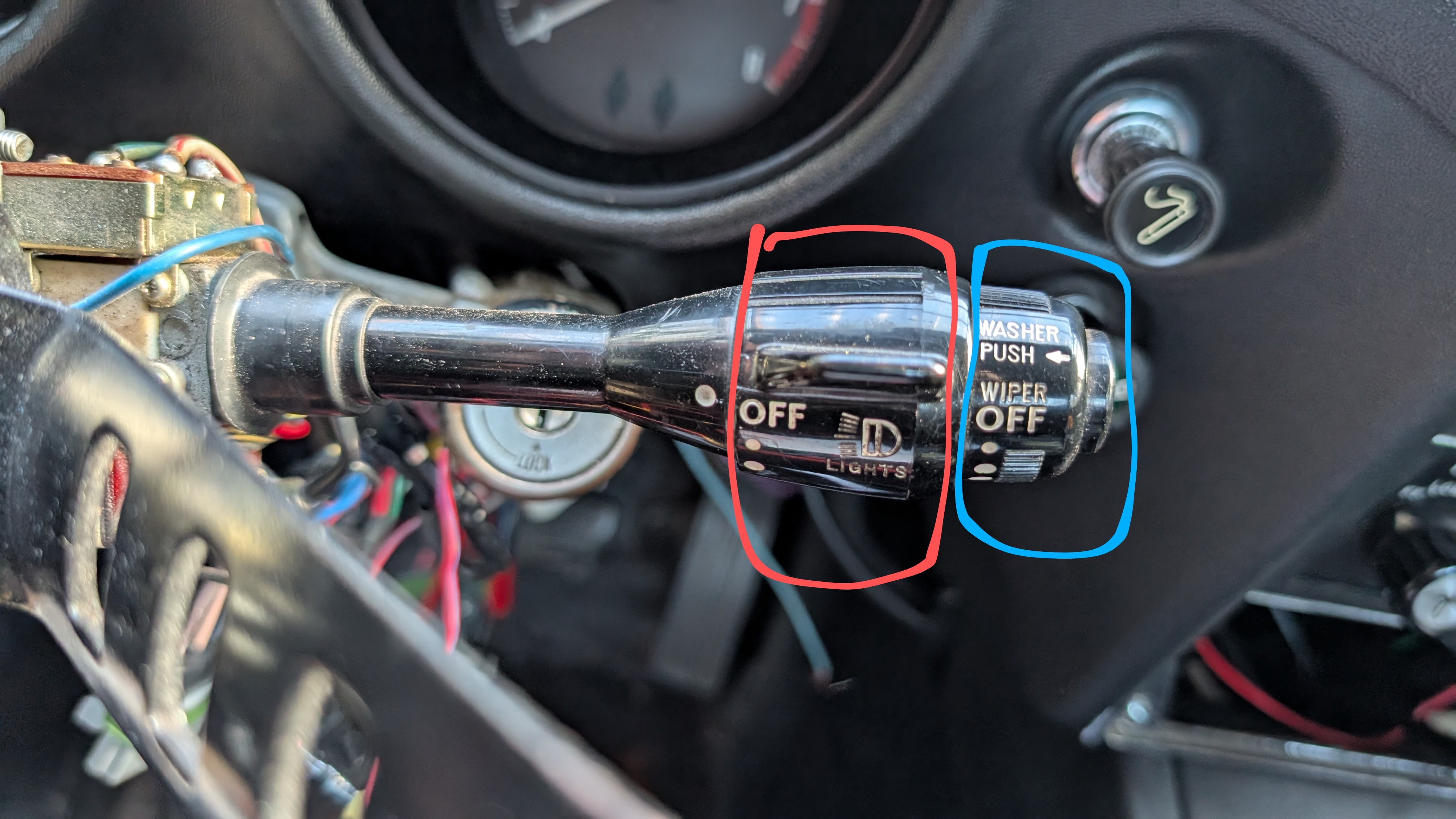 Les feux de croisement sont sur le premier cran de la bague destiné au essuie glace (bleu) et non sur la bague destiné au phare (rouge).
