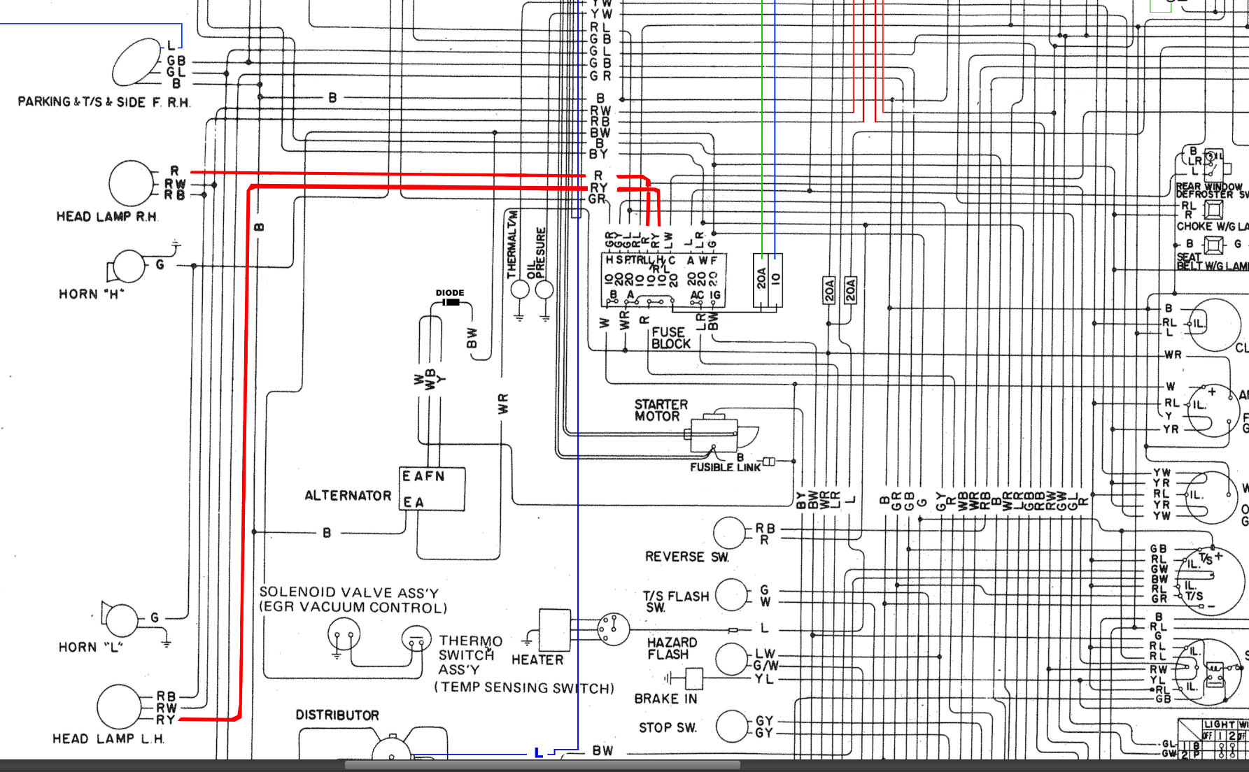 Pour moi c'est l'inverse R et RY sont les + (phares et pleins phares) qui vont à la boîte à fusible et RB et RW vont au comodo pour être commutés à la masse en fonction de la position de ce dernier ...