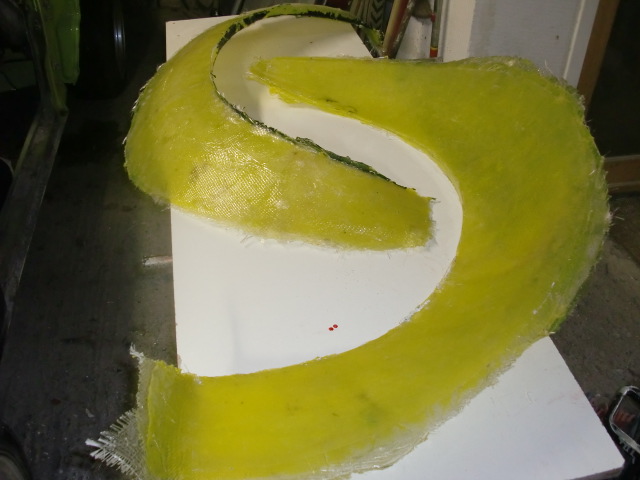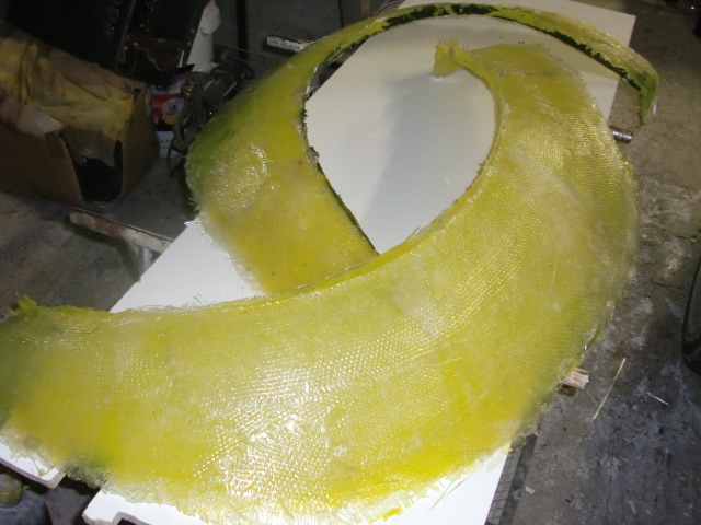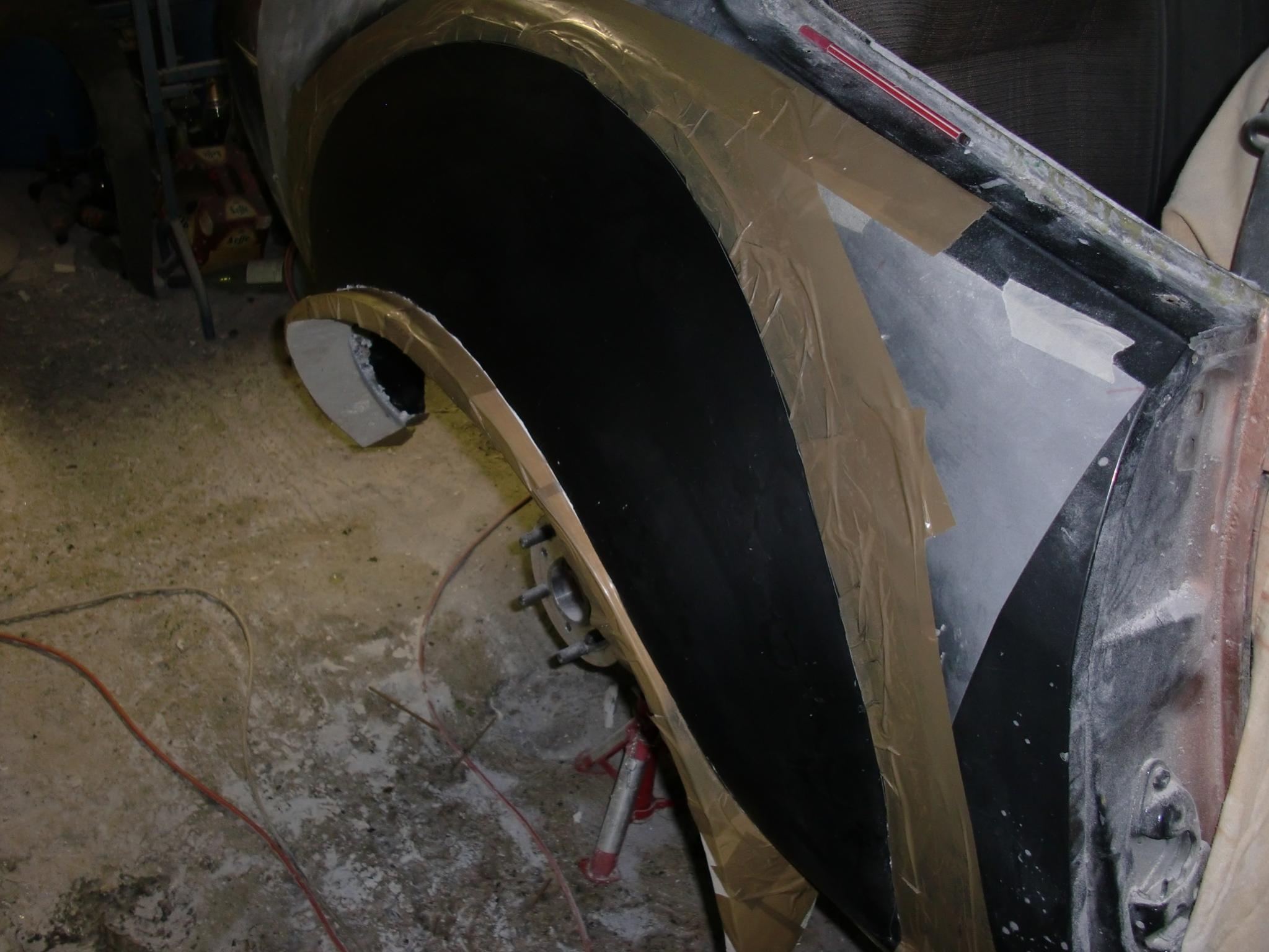 la bande de mousse qui forme l'arche va me permettre de faire un joint -congé sur le moule pour arrondir les arrêtes . ( sans toucher le pneu qui n'est vraiment pas loin.