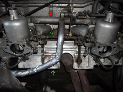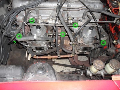 -9/ Remontage des SU 240 ( Prenez le temps avant de bien les vérifier en les démontant ). Flèche rouge la pièce de 240 remplacée au point 7. Flèches vertes le linkage entre les 2 carbus, pour ma par j'ai remis par sécurité celui de 240. L'autre flèche , car j'ai remis la tôle sous les carbus. (Tôle que je ne possédais pas). N'oubliez pas de remonter tous les tuyaux, les chokes et de faire un raccord entre les deux durites marquées d'une flèche au point 2.