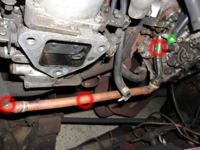 -3/ Voila ce que vous obtenez, vous desserrez et enlevez les durites marquées d un rond vert ainsi que les arrivées d'essence. Les deux durites marquées d'une flèche font passer le liquide de refroidissement dans les carbus, attention à celle en rouge. Il faudra la boucher car beaucoup de liquide s'en écoule.