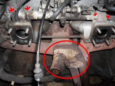 -8/ voila la vue de la pipe 260 sans ses carbus. j'en ai profité pour enlever le système entouré en rouge, car il ne tenait plus vraiment et ne me servait pas à grand chose. Vous noterez également les 4 flèches, j'ai démonté la pièce qui relie les 2 pipes par ces 4 vis, pour la remplacer par celle de 240 car elles sont différentes et c'était plus simple ainsi.