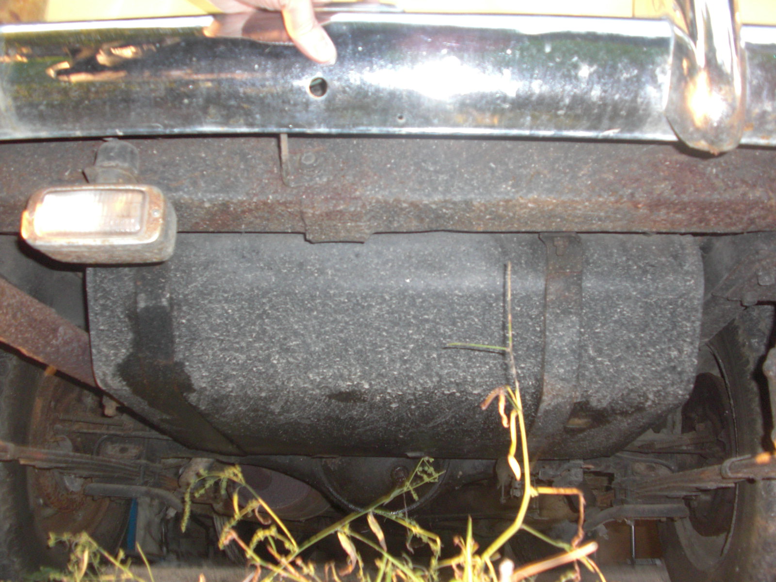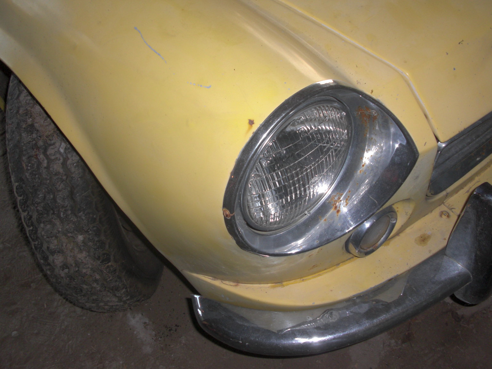 La carrosserie n'est pas trop mal. Il n'y a pas de rouille perforante du tout mais il y a quand même de la rouille de surface. La peinture est d'origine, pas camouflage détecté, à part les deux ailes avants qui ont été repeinte à la bombe en bas. Il y a quand même des cloques dans la peinture par ci par la. Les chromes sont piqués.