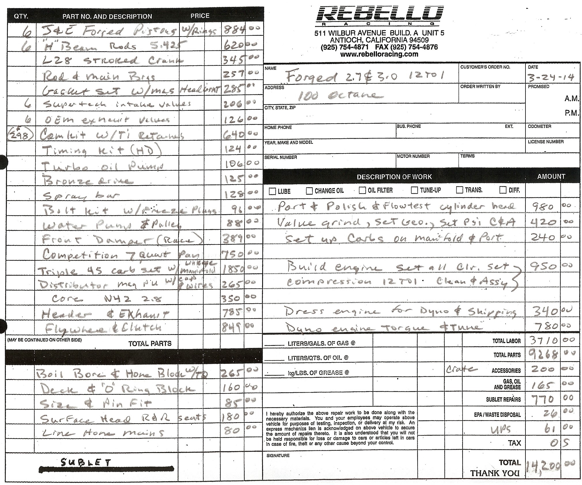 "Jean, I have attached two dyno sheets. One from the engine we used to win the panamericana la carrera this year and the other is a 2,4l vintage roadrace engine. If you have some of the parts like carburation and oil pans etc. it cost about $8500 plus dyno. I have attached a price sheet with everything for a 2.4 to 3.0L, you can pick and choose. 7 to 10 weeks depending on when the order is placed.