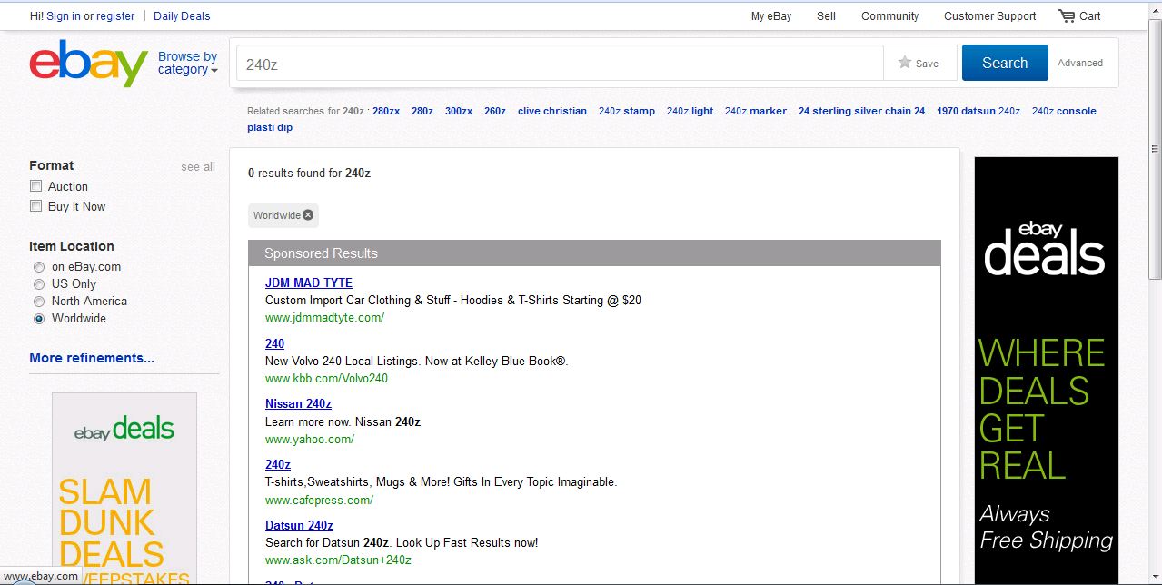 C'est quoi ce bordel avec ebay.com? Je n'arrive plus à voir les annonces, impossible d'utiliser leur moteur de recherche, ça me sort 0 résultats pour '240Z'. Est ce qu'on est bloqué? C'est le retour vers le moyen age ou quoi?