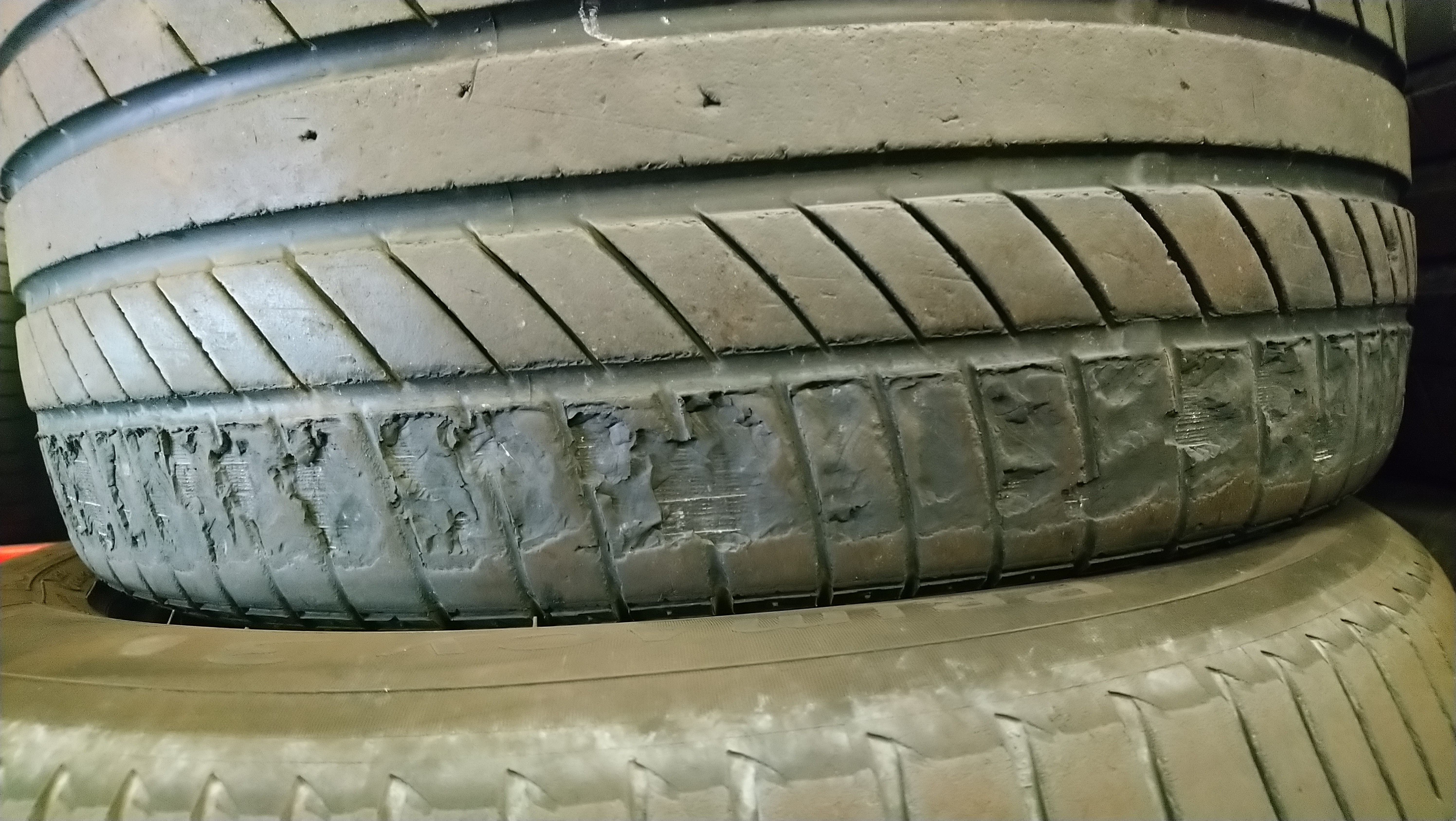J'ai eu une méchante surprise en mettant les yeux sur mes pneus, ils étaient littéralement en train de s'effriter! Des morceaux s'enlevaient et c'était pas beaux à voir, mais le plus étrange c'est que c'était dans le sens de rotation du pneu "freinage". La matière s'arrache comme si j'avais fait des burns en marche arrière... Et là, j'ai repensé aux bosses et au ressenti bizarre que j'avais au freinage dans la ligne droite avant le banking de Montlhéry, j'avais l'impression que l'arrière était sous ABS, genre limite blocage de roues par saccades... Mes pneus étaient vieux et je pense qu'ils n'ont pas apprécié les combinés filetés + les freinages très appuyé . Obligé de les faire changer en urgence car je devais prendre la voiture quelques jours plus tard pour aller sur circuit..