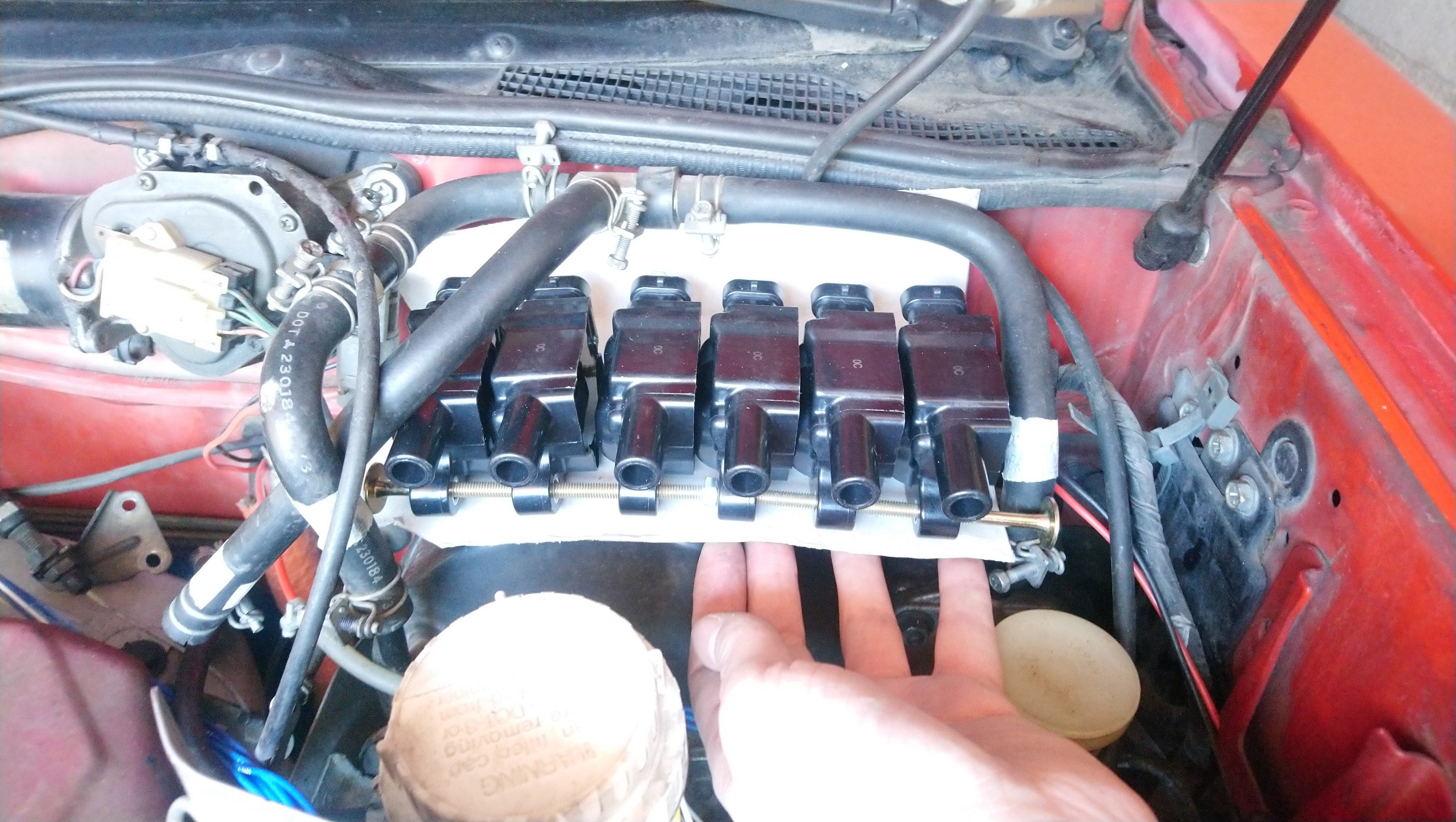 N'ayant pas de place sur les couvres-culasses pour placer les bobines, j'ai choisi de les positionner au dessus du mastervac: