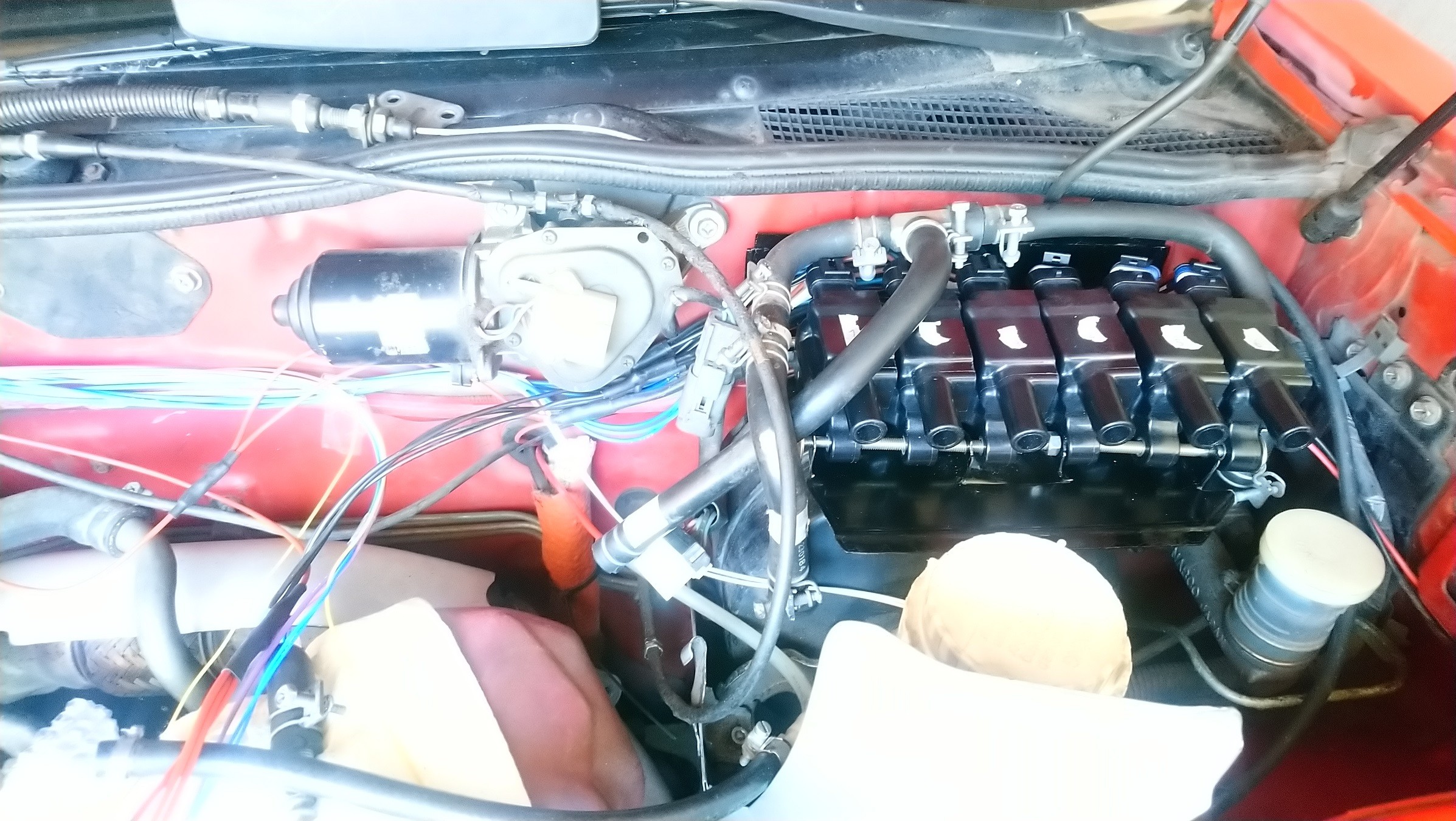 Une fois que j’ai reçu ma maxi commande, j’ai commencé à mettre en place le faisceau pré-câblé, j’ai placé les éléments à leur place définitive et j’allais tirer les fils d’alimentation et de masses quand je me suis rendu compte que j’avais fait une erreur de débutant. J’ai estimé les longueurs de câbles en mesurant pour CHAQUE bobines et CHAQUE injecteurs, sauf que les + et les masses se regroupent, on n’a pas 6 fils de masses et 6 alimentations d’un bout à l’autre. Du coup, au lieu d’utiliser par exemple 6x 1.2mètre de fils d’alimentation pour les bobines j'en ai utilisé seulement environ 3mètres… Idem pour les masses qui sont doublés sur ces bobines. En gros j’ai commandé 2 à 3 fois trop de câblages